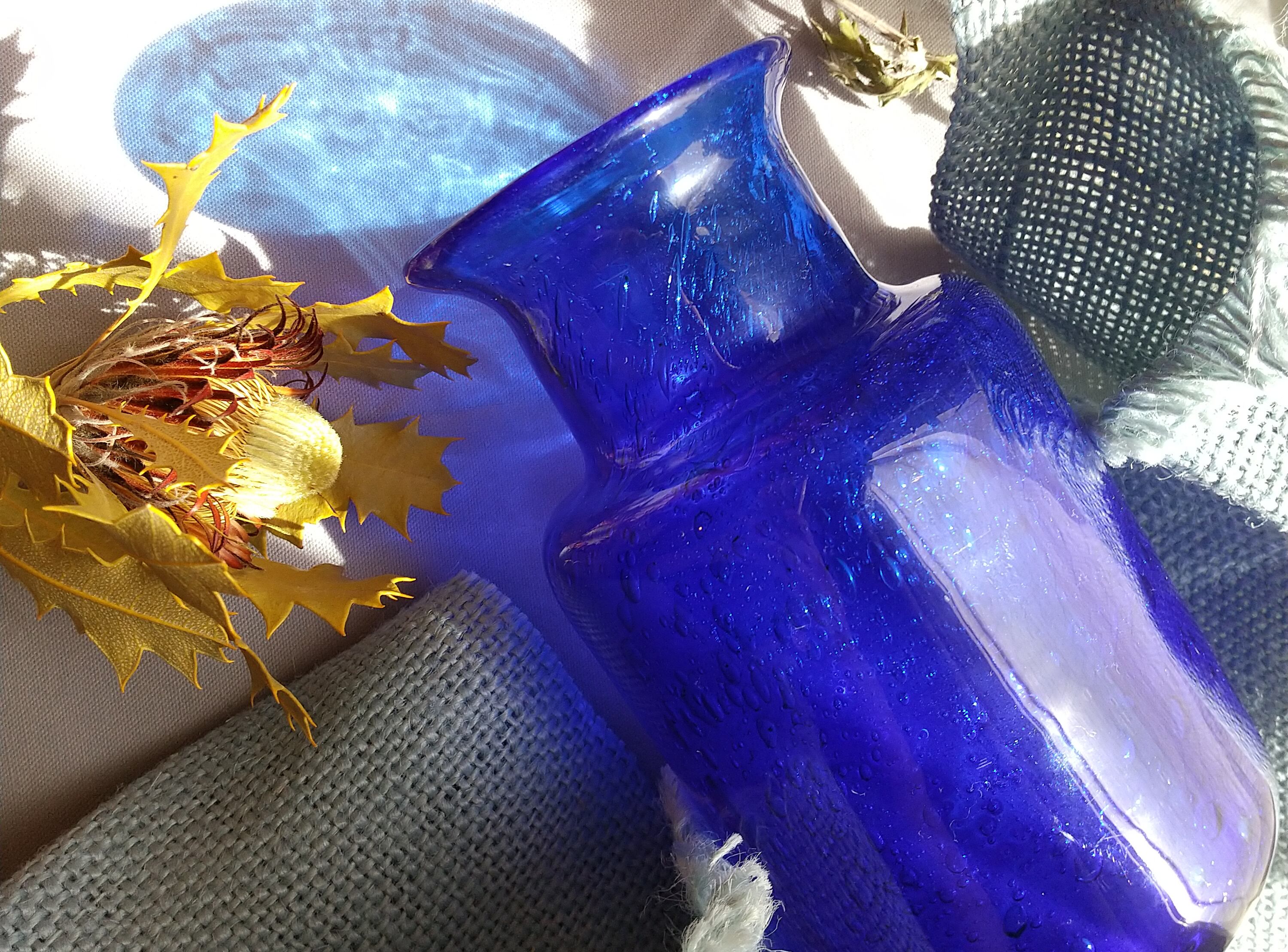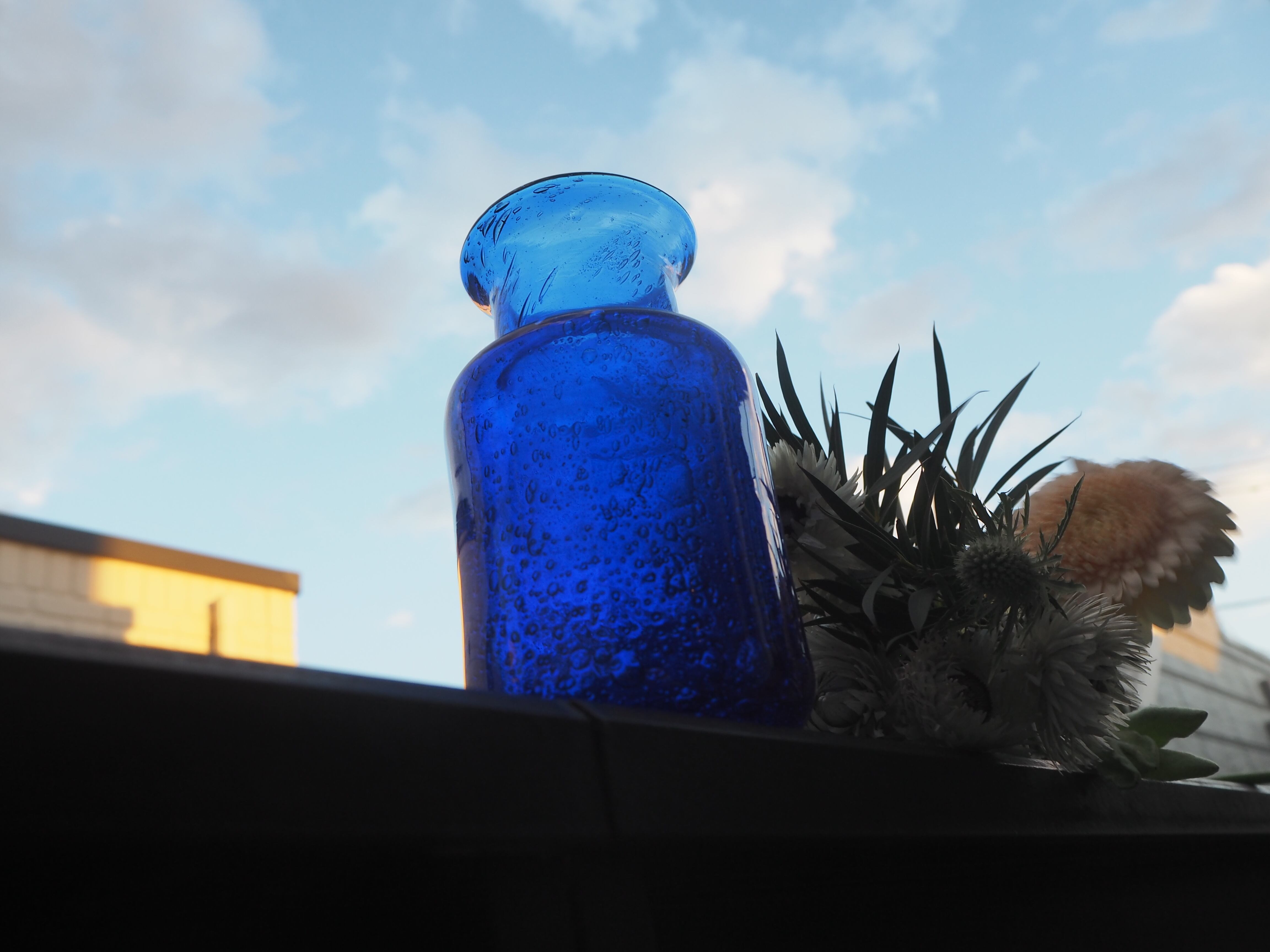 大小の気泡を豊富に含んでいて、海や宇宙を連想させる美しさです。日差しの入る場所に飾れば、青く美しい影を見せてくれますよ。花器としてはもちろん、飾っておくだけでも抜群の存在感があります。ぜひ美しい青と気泡に魅了されてください。