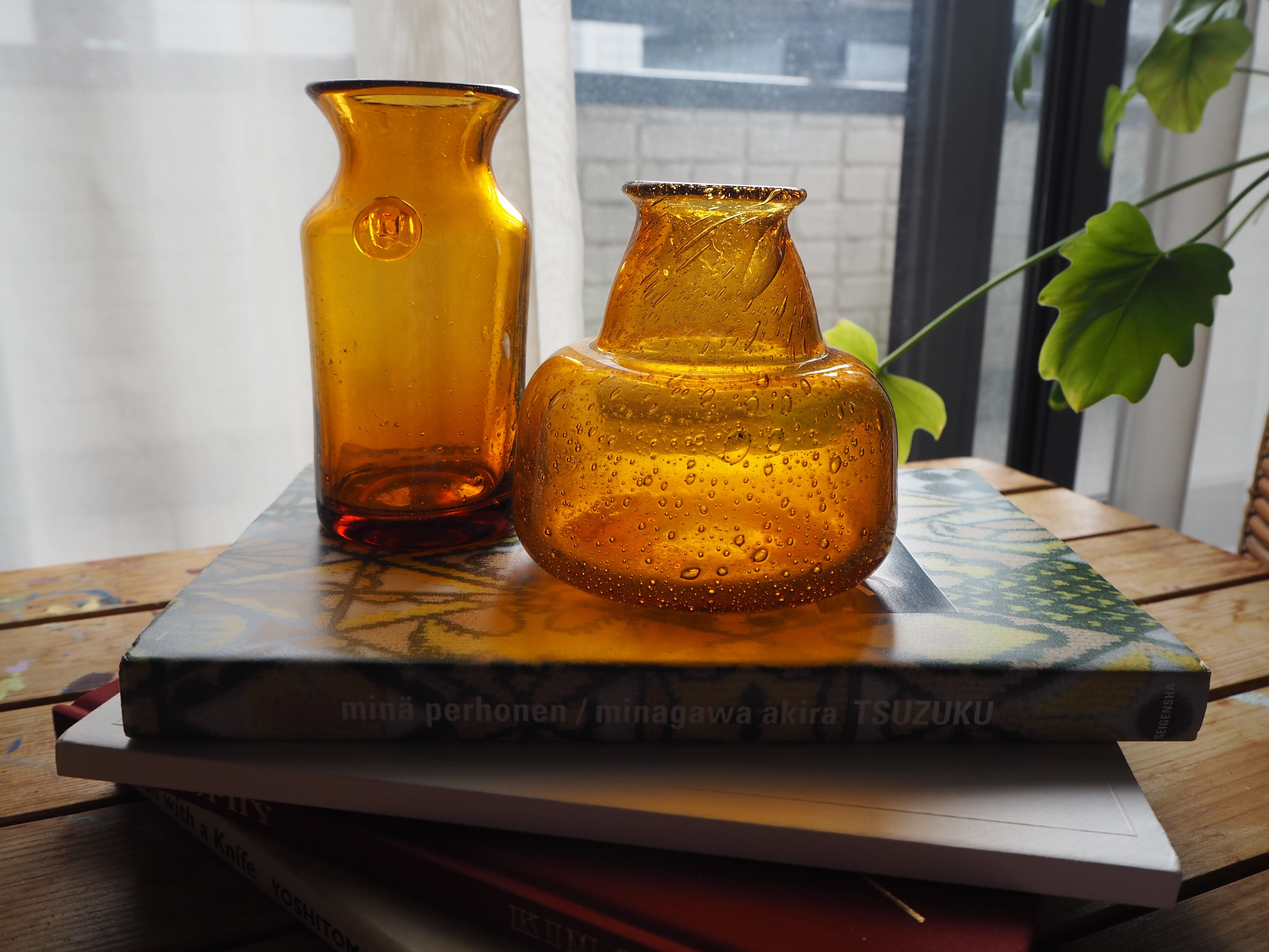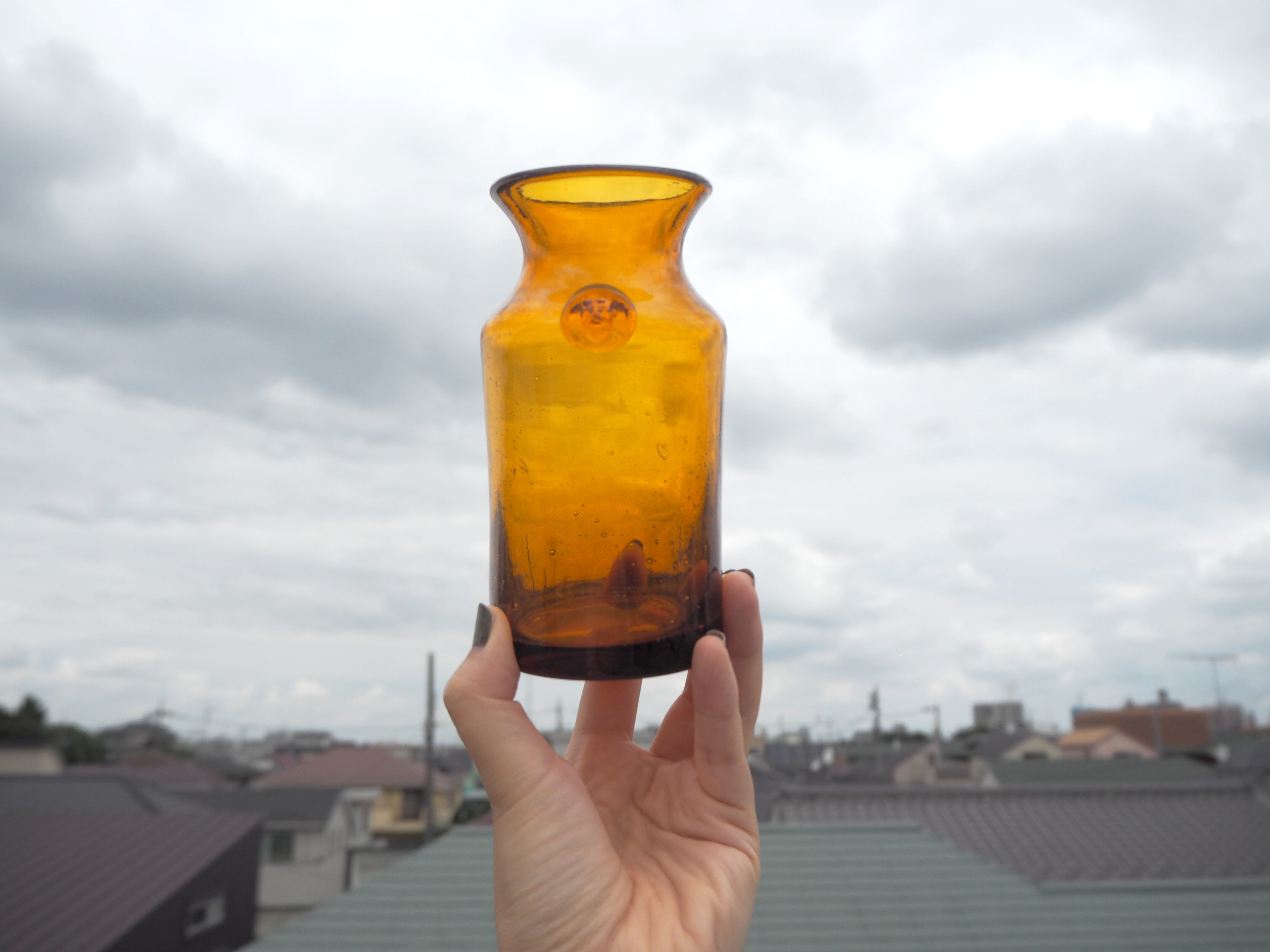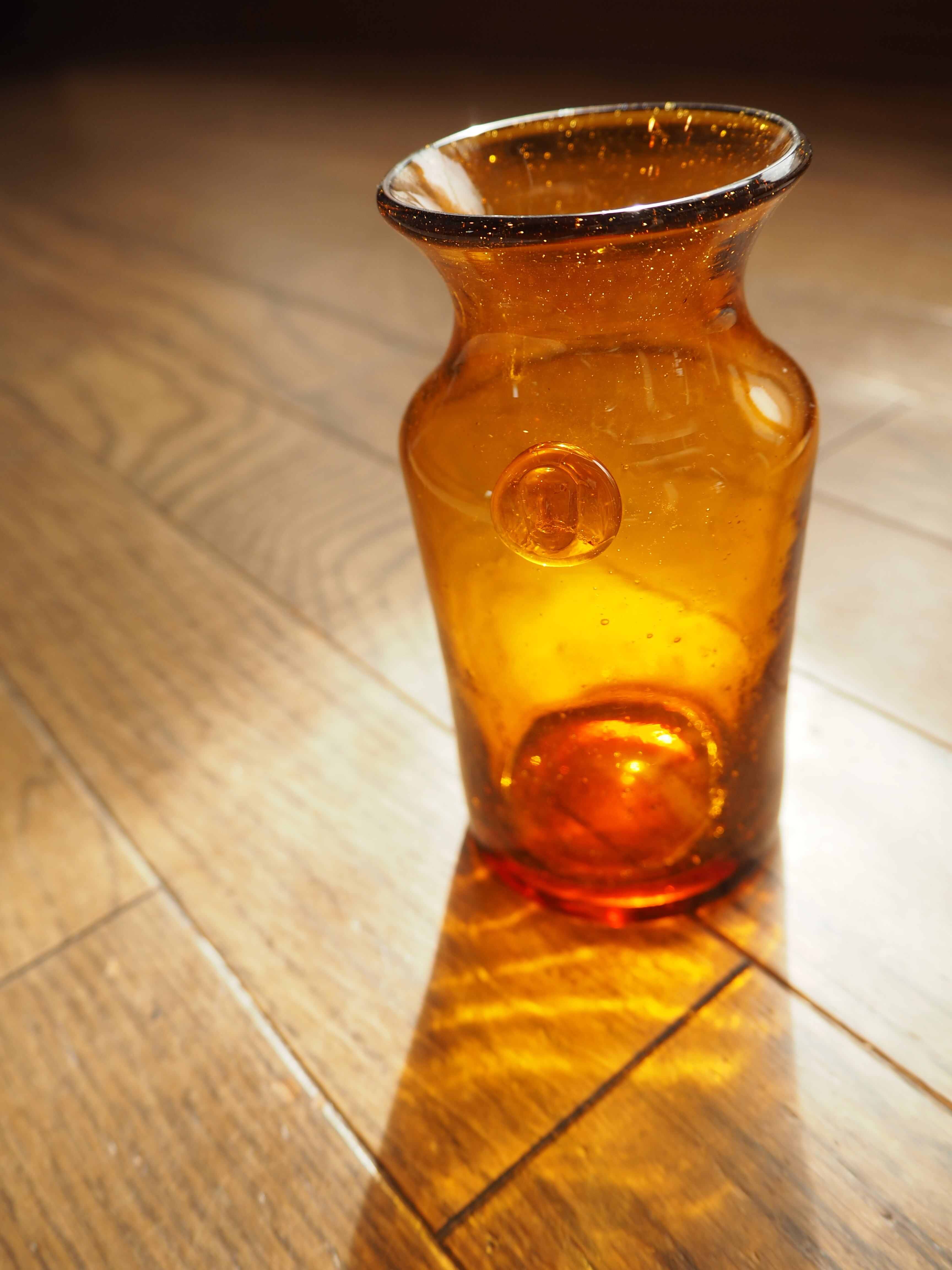 美しいアンバー色で全体的に細かな気泡を含んでいます。花器としてはもちろん、飾っておくだけでも抜群の存在感があります。扱いやすいサイズ感です。