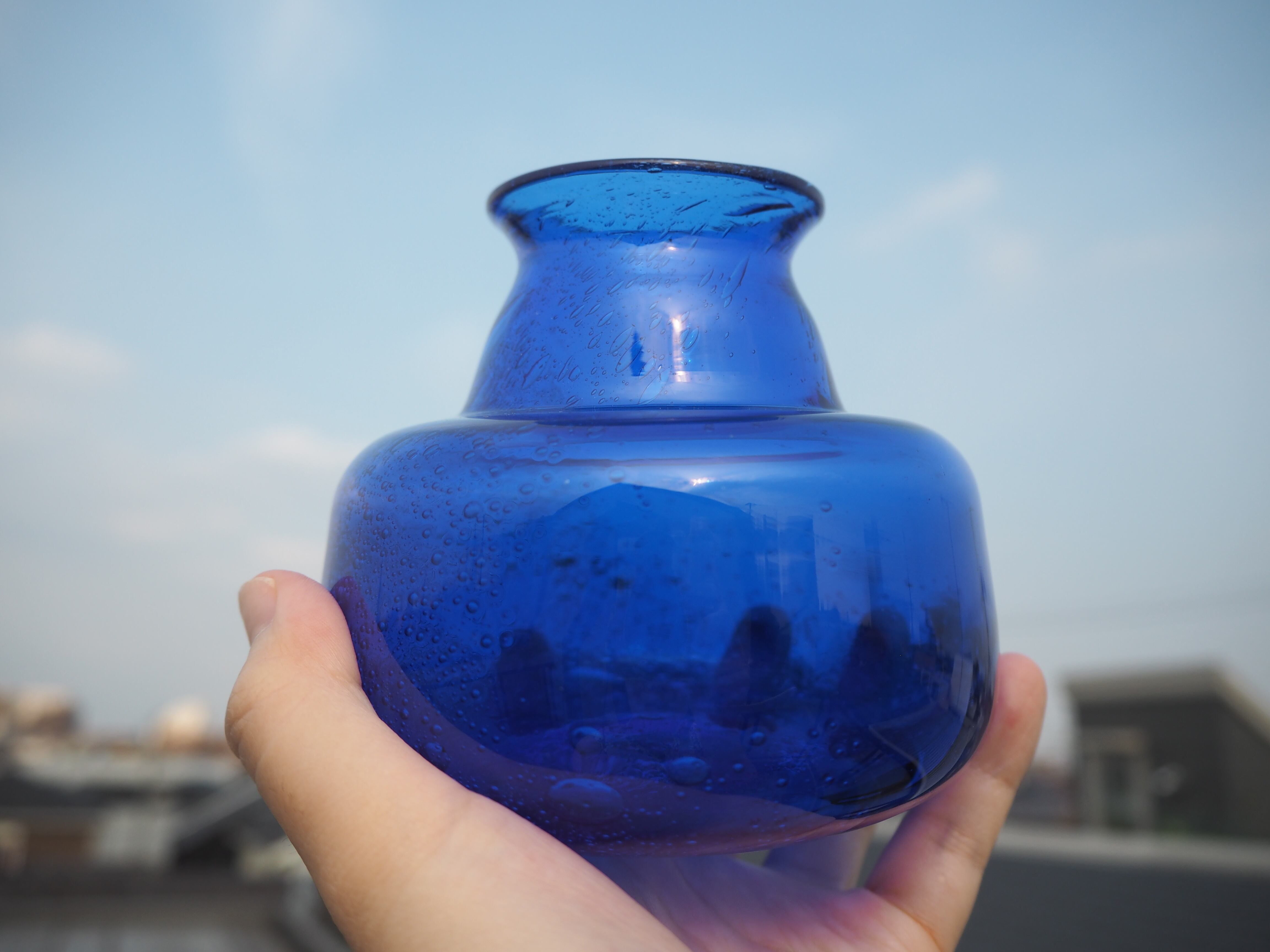 美しく奥深い青色が魅力的。大小の気泡を豊富に含んでいます。1輪挿としても使えるころんとしたかたちが可愛らしいです。花器としてはもちろん、飾っておくだけでも抜群の存在感があります。