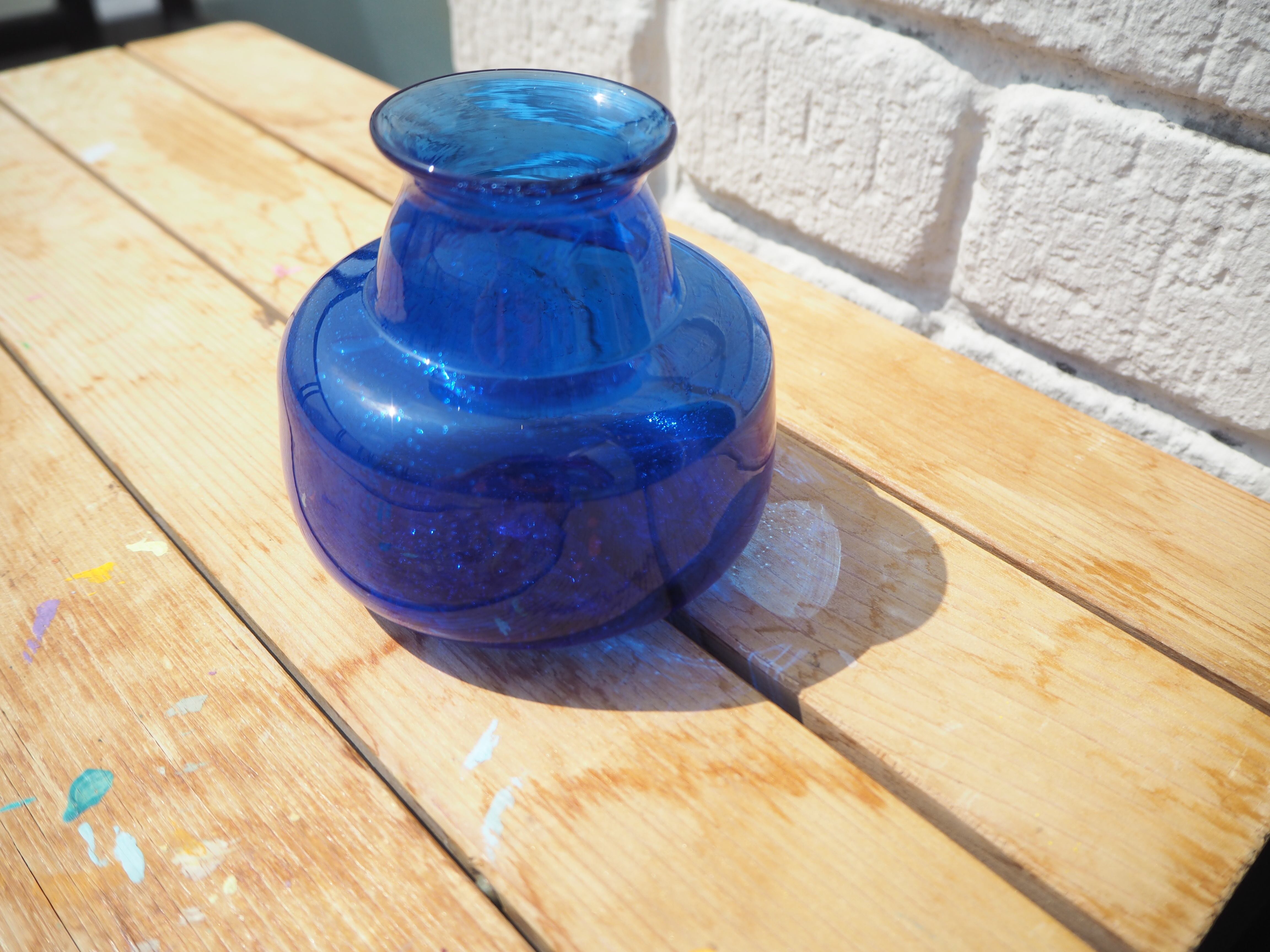 コロンとした形が愛らしい、エリックホグランのブルーのフラワーベースです。