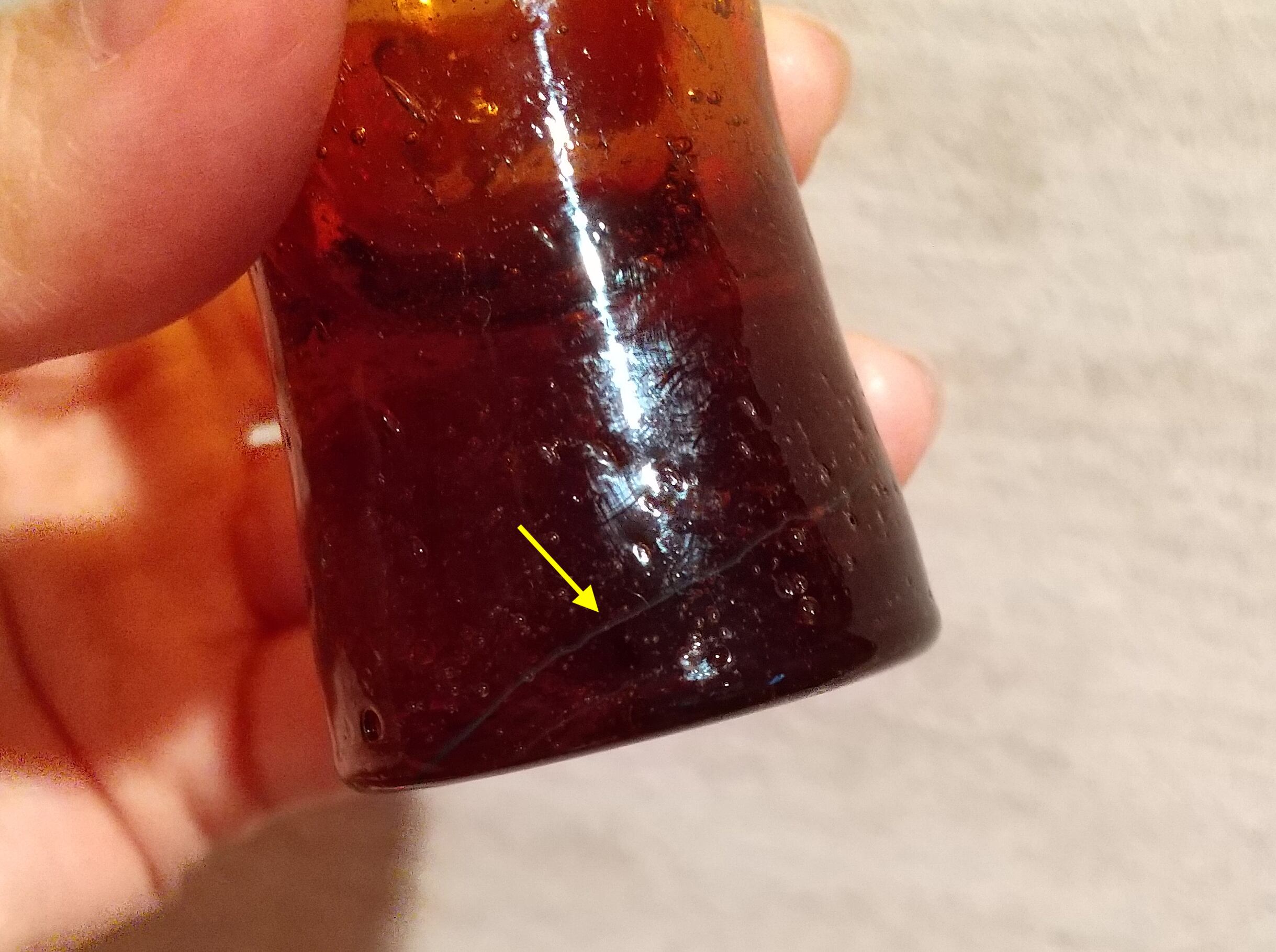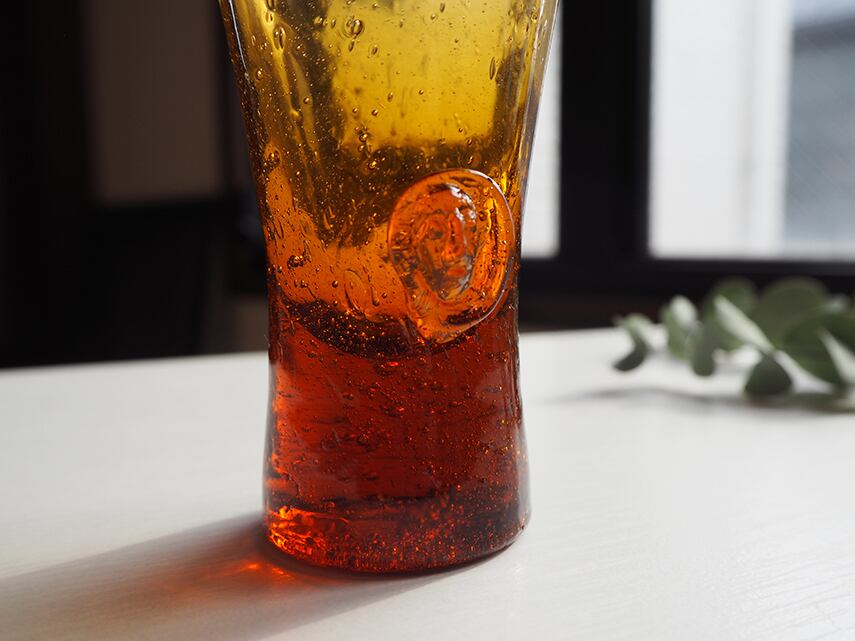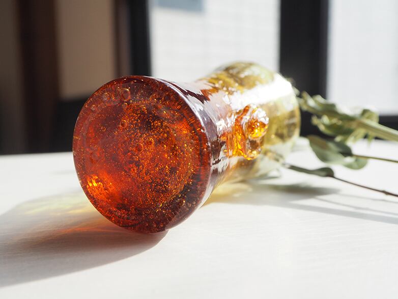 小さなボディに気泡をたっぷりと含んだ、とても美しい琥珀色のガラスです。