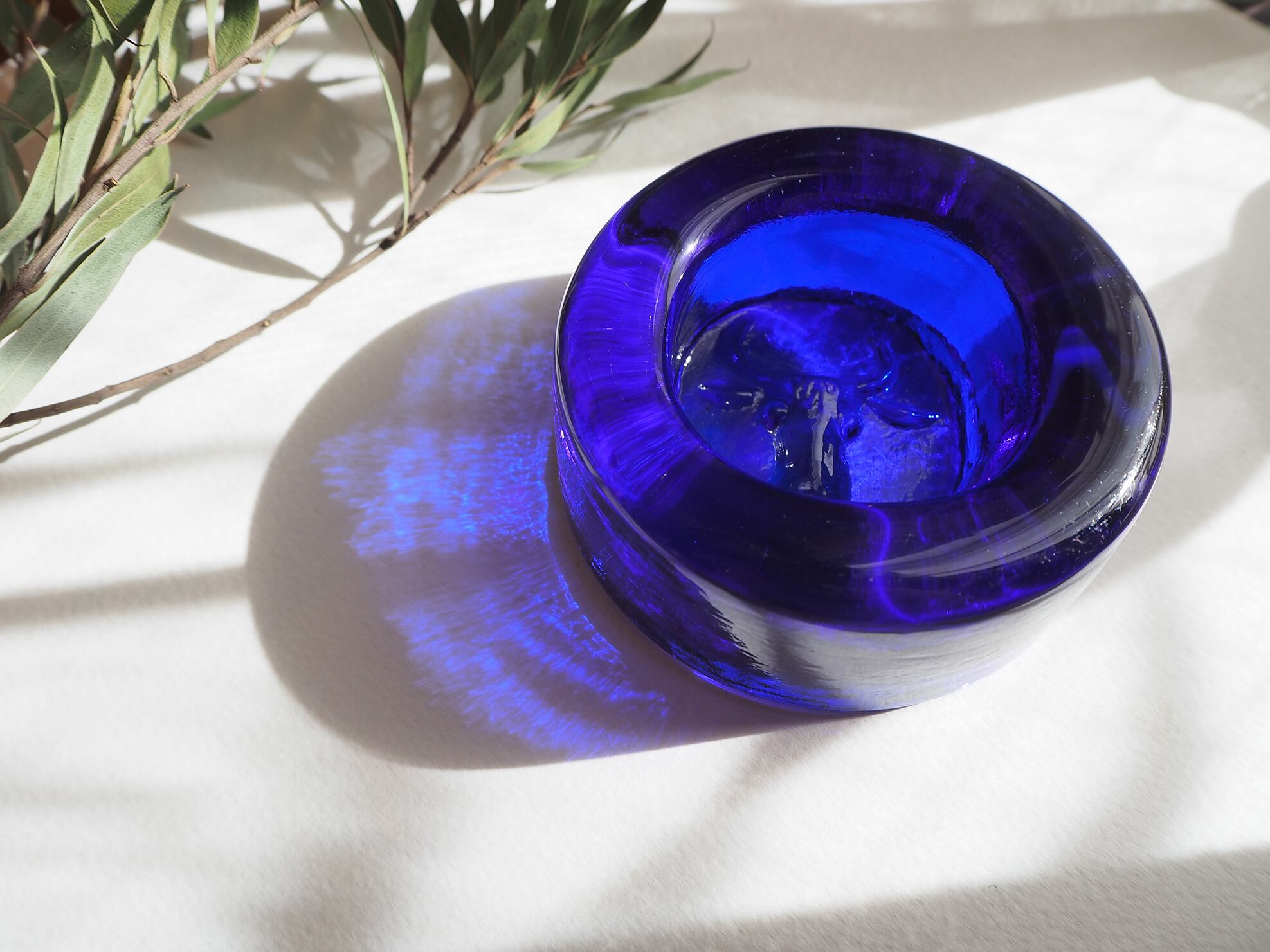 高温のガラスにモチーフを型押しされて作られました。つるつるなめらかなふちは、独特な曲線を描いていてハンドクラフトならではの温かみを感じます。濃厚なブルーは光のあたり方によって、紫色っぽく輝いたりと、表情豊かです。