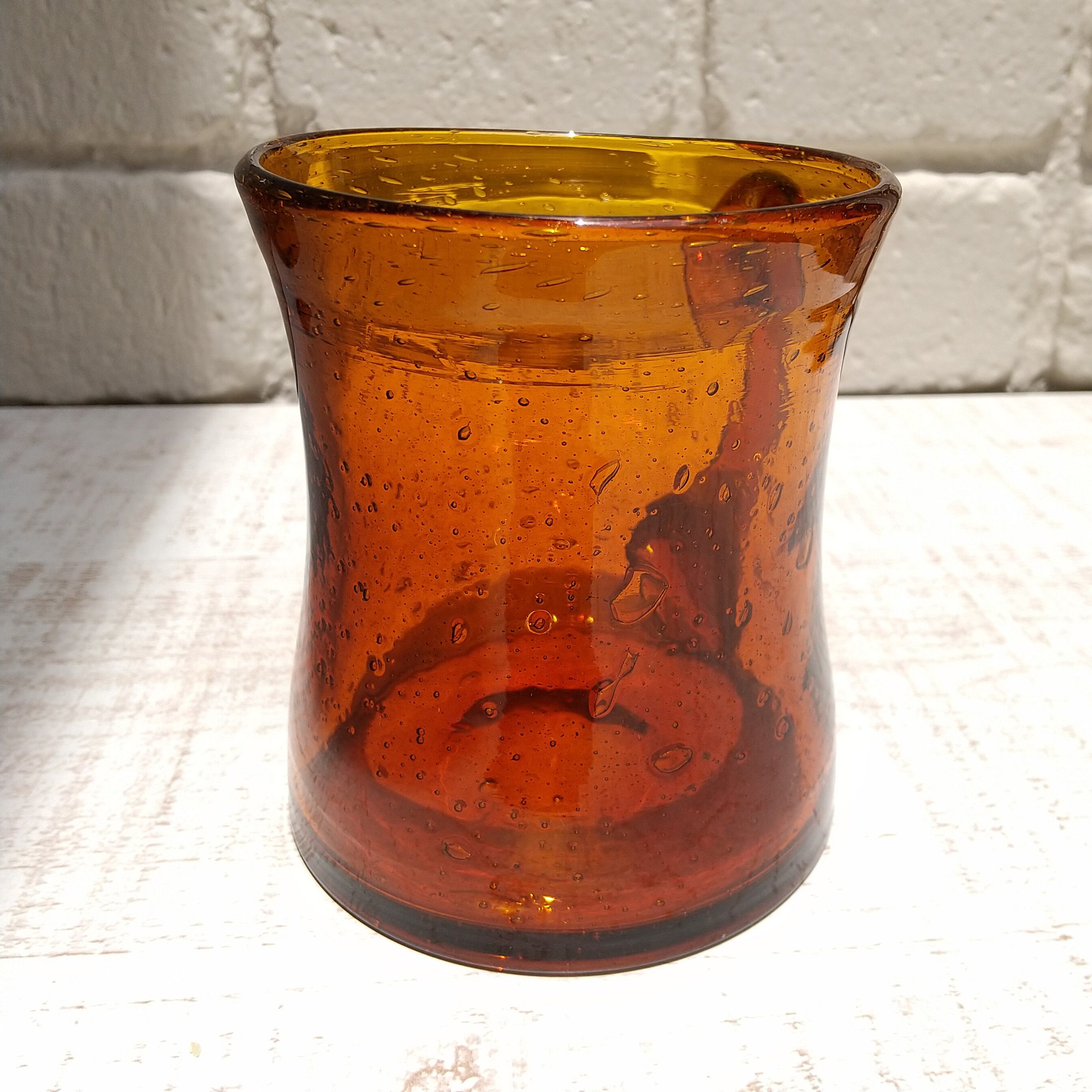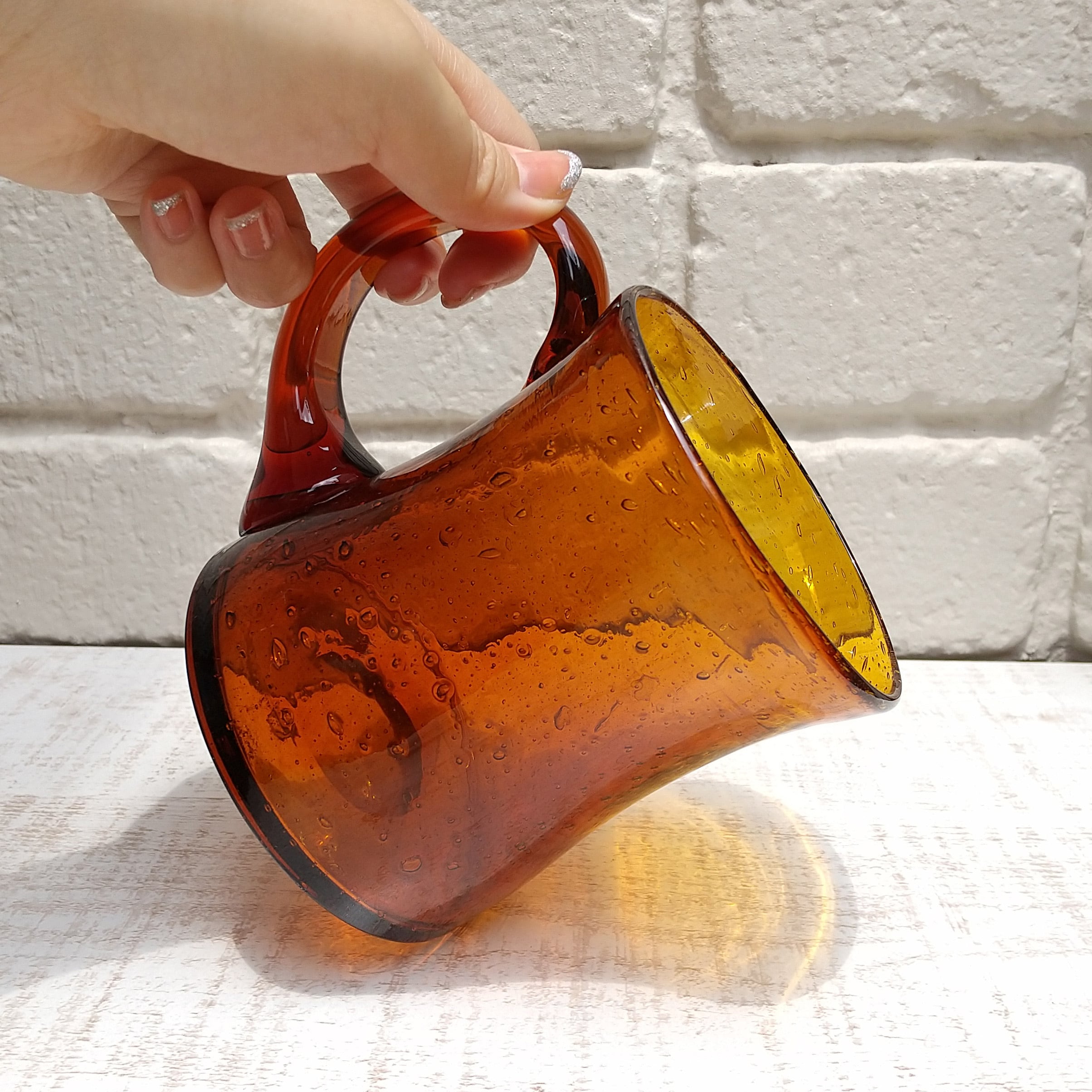 こっくりと香ばしい琥珀色が魅力的!日差しの入る場所に飾ると美しい影を見せてくれます。全体的に大小の気泡が散らばっていて、涼しげなジョッキです。曲線のフォルムと、ぽってりと大きな取手が個性的です。職人が手作りしたシェイプの柔らかな歪みはもちろん、気泡の量や動きも、そのガラスだけの個性です。たっぷりした大きさがあるので、フラワーベースやカトラリー入れなど、あなたのアイデアで楽しんでください♪