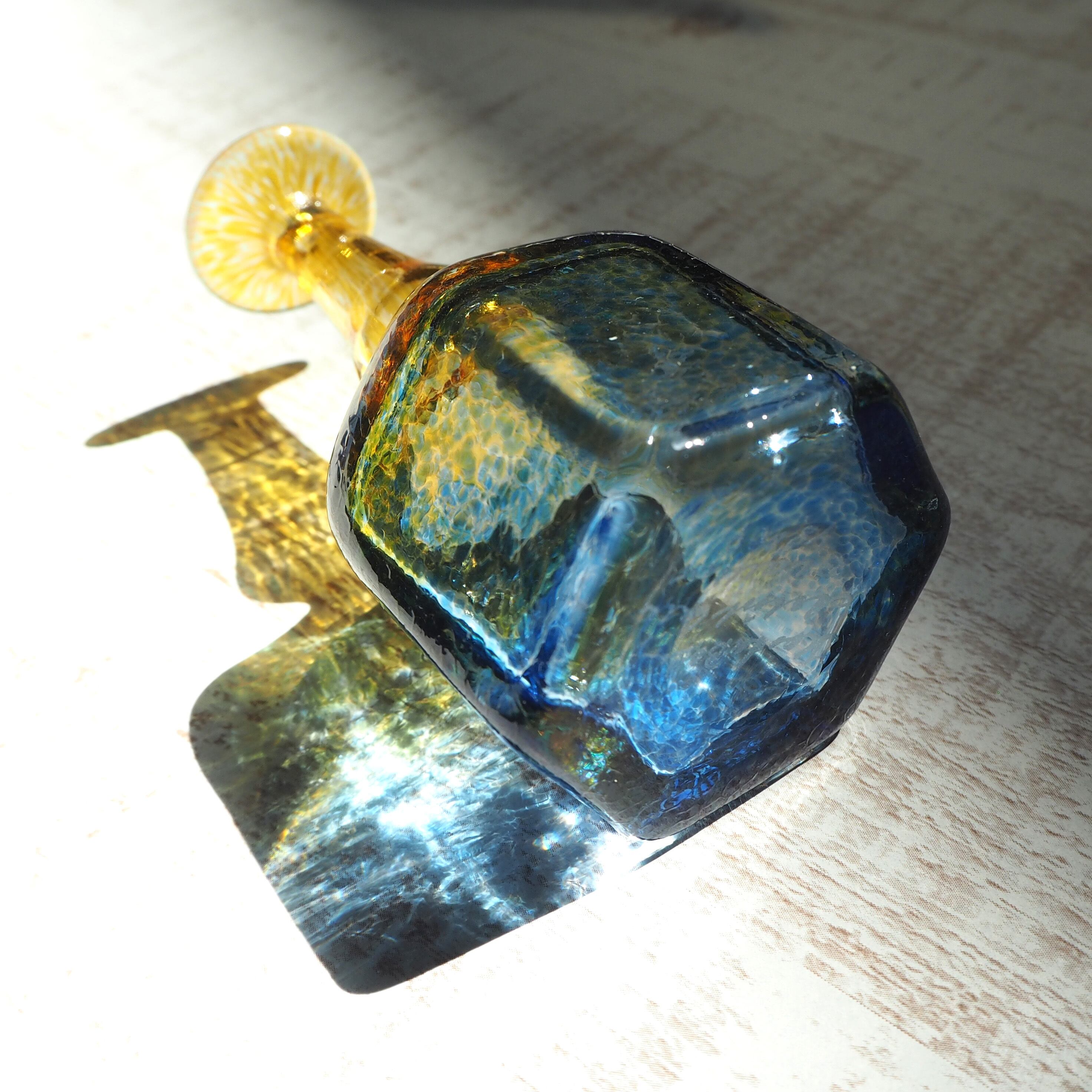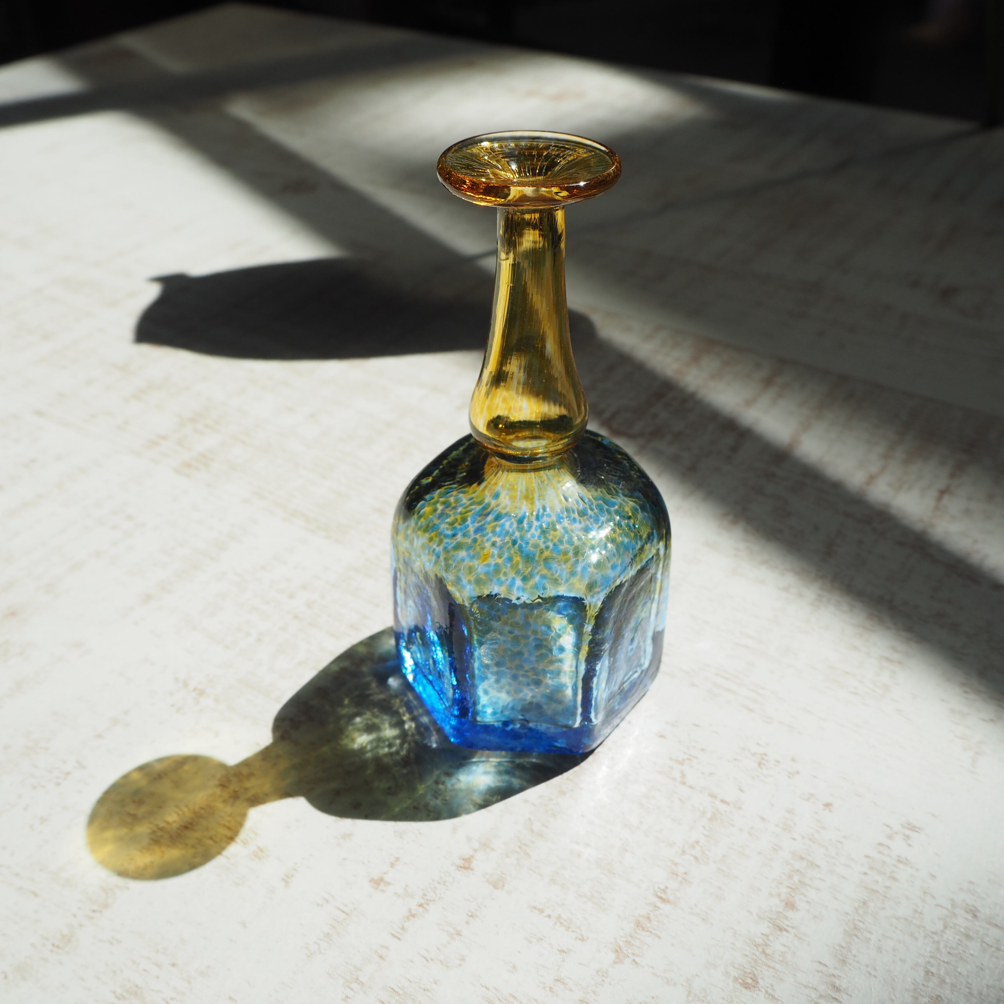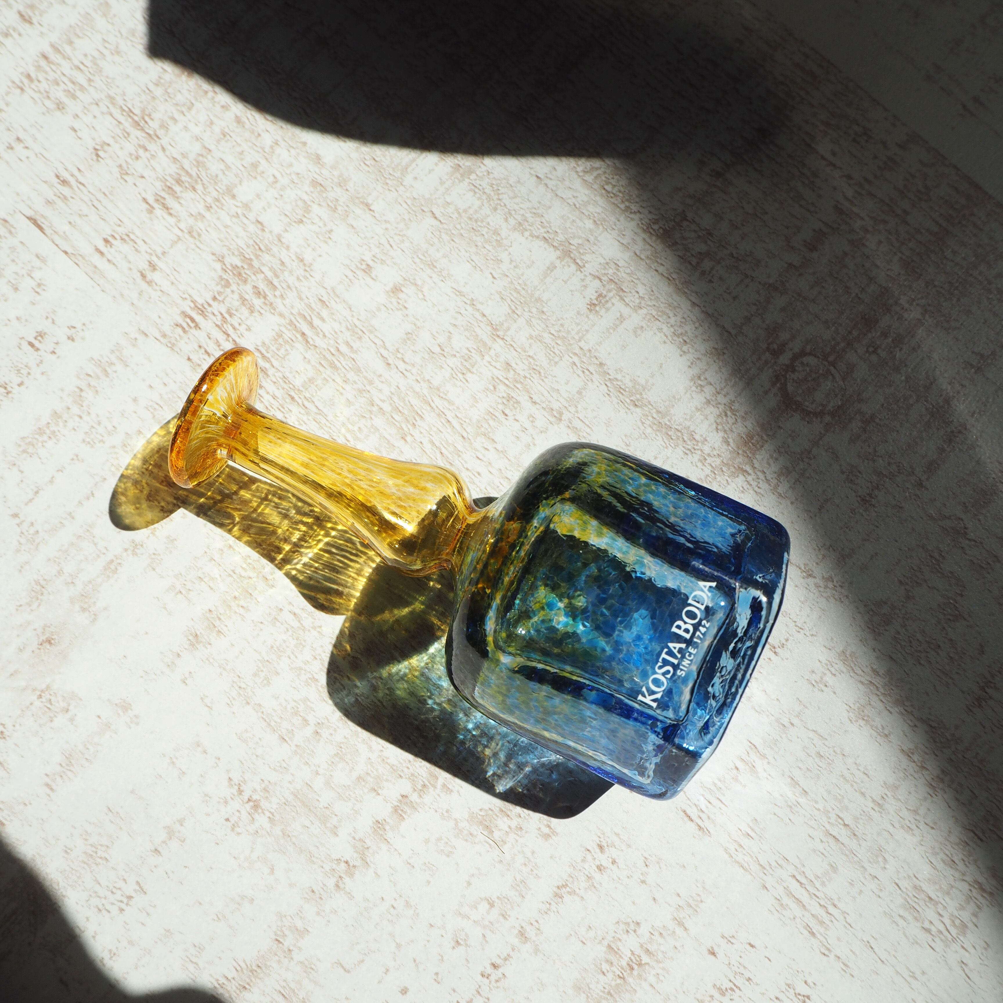 スウェーデンのKosta BodaにてBertil Vallien(バーティル・ヴァリーン)がデザインしたガラスベースです。バーティル・ヴァリーンのデザインの中でも有名なAntikvaシリーズ。小さな可愛らしいフォルムの中に、色彩鮮やかな模様がとても繊細で印象的な作品。日差しに当たった瑞々しいグラデーションの影は、まるで湖水のようにとても美しいです。細くて繊細な口にも細かな模様が施されています。首の部分の水色から黄色に向かうグラデーションも素敵です。とても小さな一輪挿しですが、ガラス作品として飾っておくだけでもお楽しみいただる抜群の魅力があります。