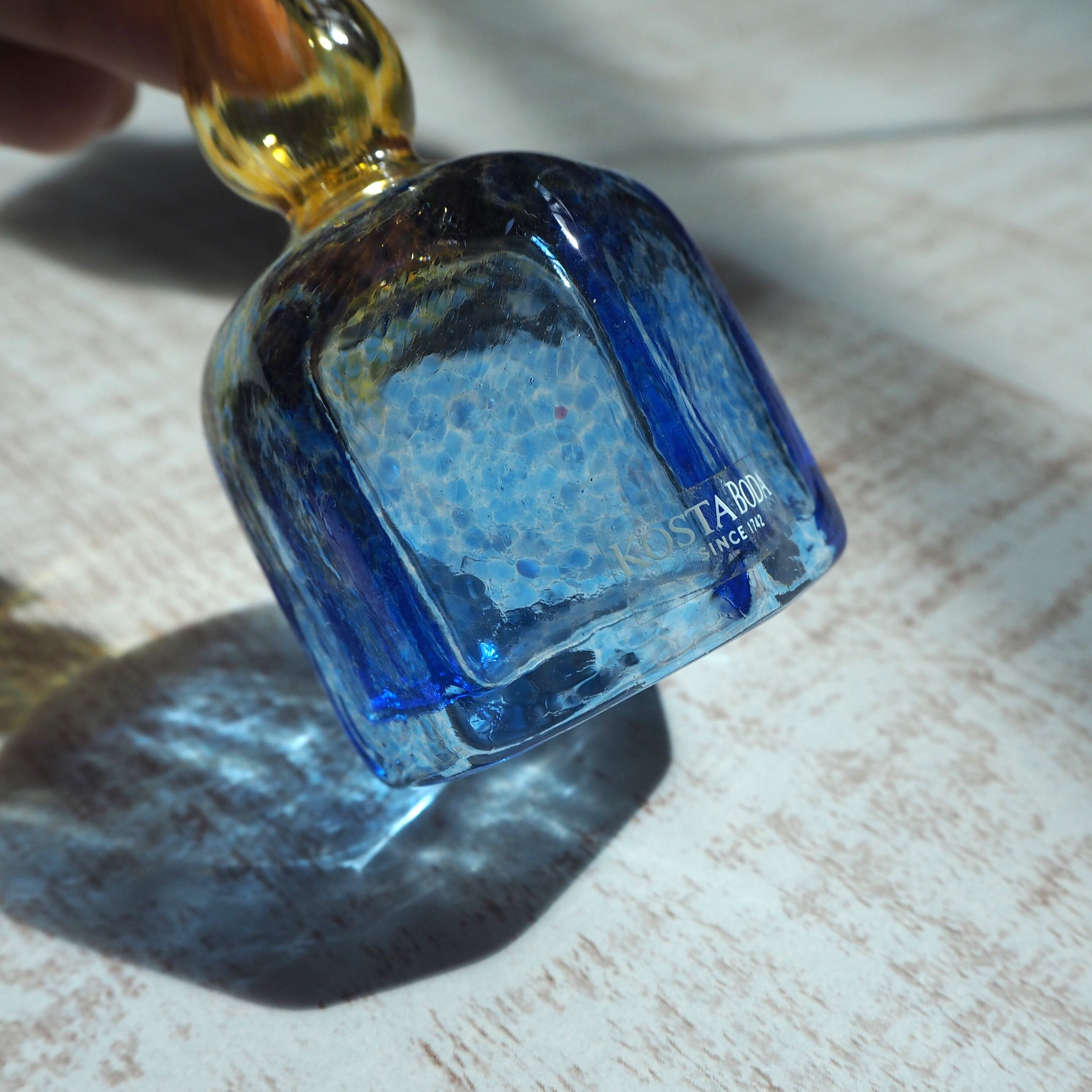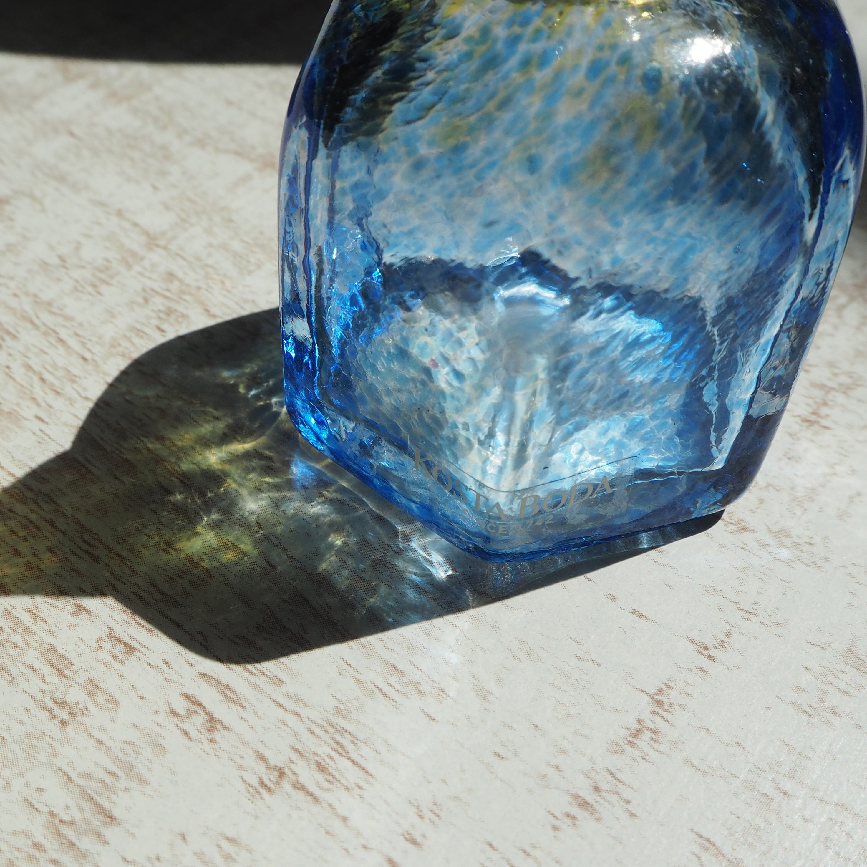 スウェーデンのKosta BodaにてBertil Vallien(バーティル・ヴァリーン)がデザインしたガラスベースです。バーティル・ヴァリーンのデザインの中でも有名なAntikvaシリーズ。小さな可愛らしいフォルムの中に、色彩鮮やかな模様がとても繊細で印象的な作品。日差しに当たった瑞々しいグラデーションの影は、まるで湖水のようにとても美しいです。細くて繊細な口にも細かな模様が施されています。首の部分の水色から黄色に向かうグラデーションも素敵です。とても小さな一輪挿しですが、ガラス作品として飾っておくだけでもお楽しみいただる抜群の魅力があります。