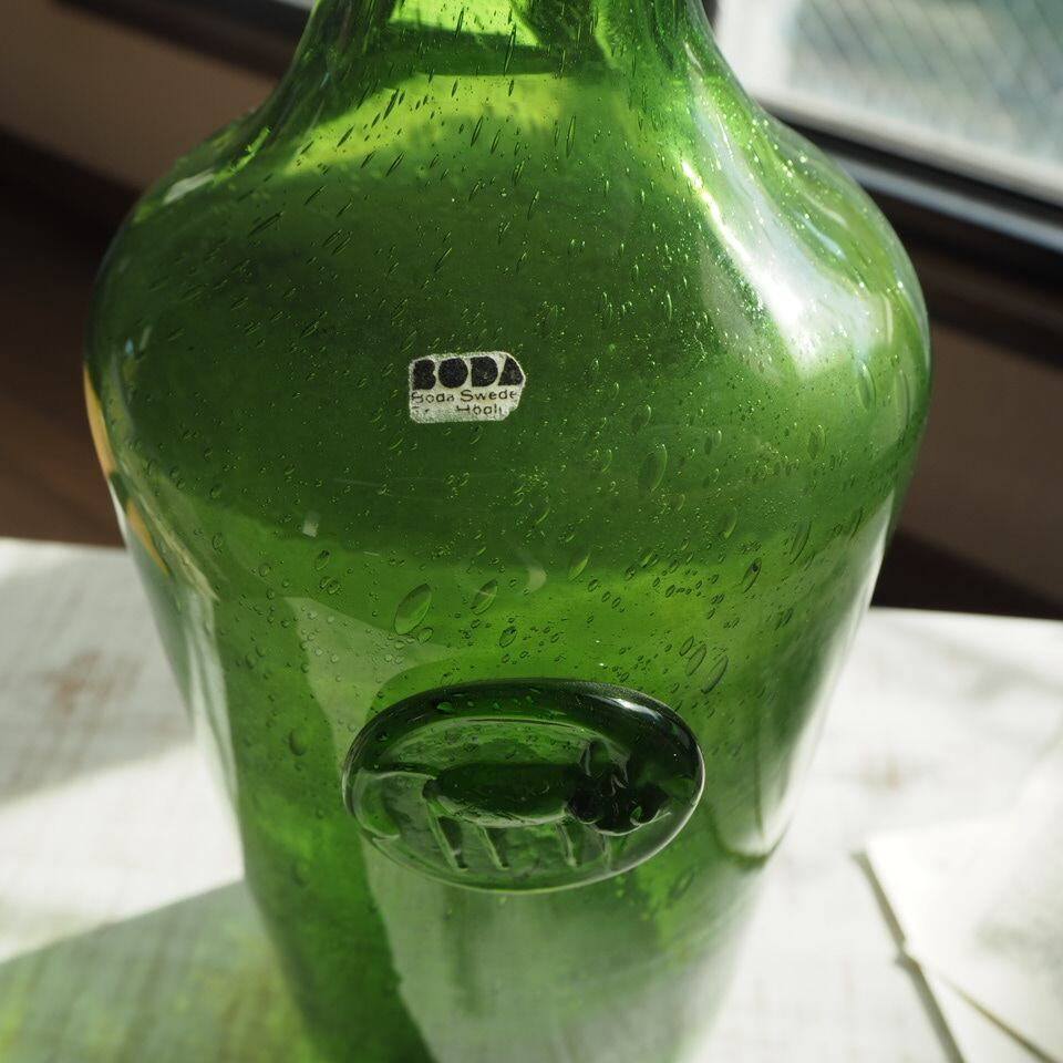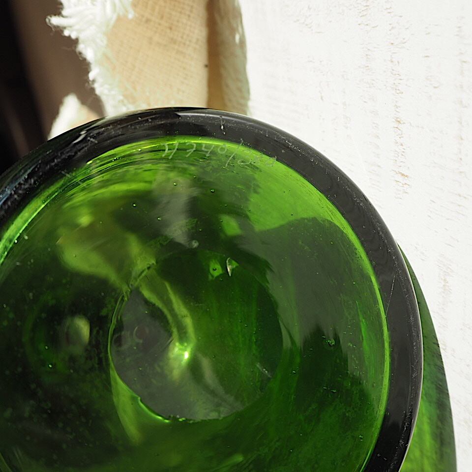 明るい緑色のボトルに猫のワッペンが型押しされた、エリックホグランのちょっぴりレアなヴィンテージガラス。大小様々で躍動感のある気泡が全体にたっぷり含まれています。飾っておくだけでも抜群の存在感がある作品です。