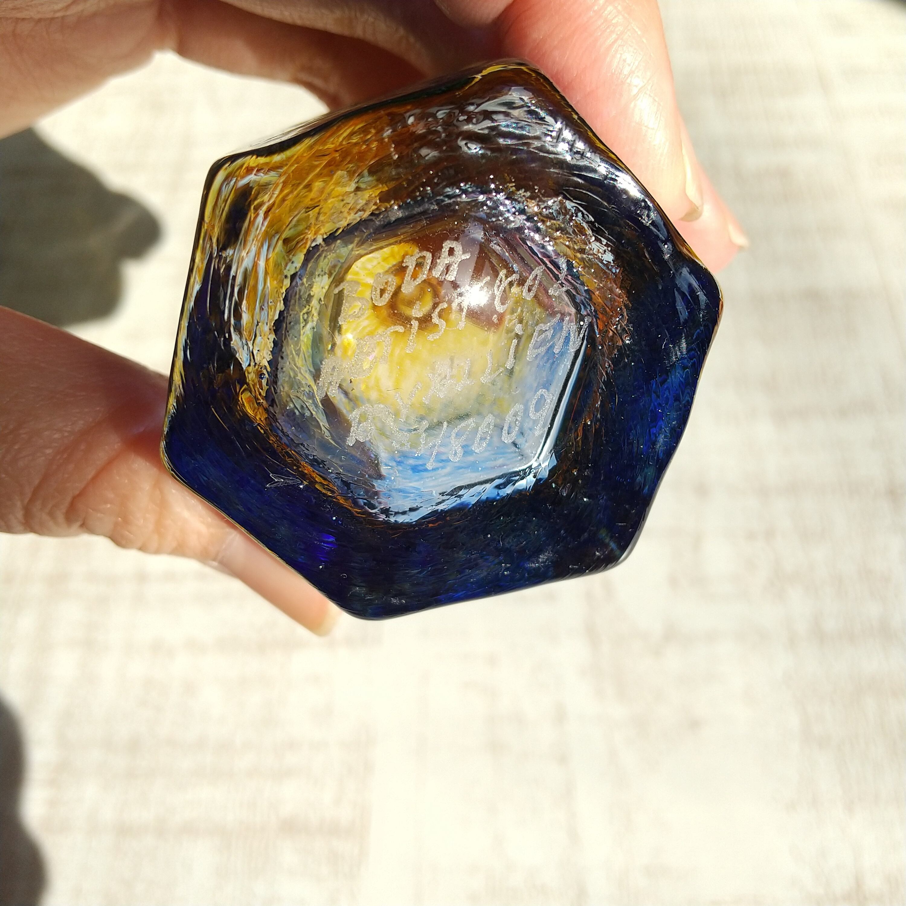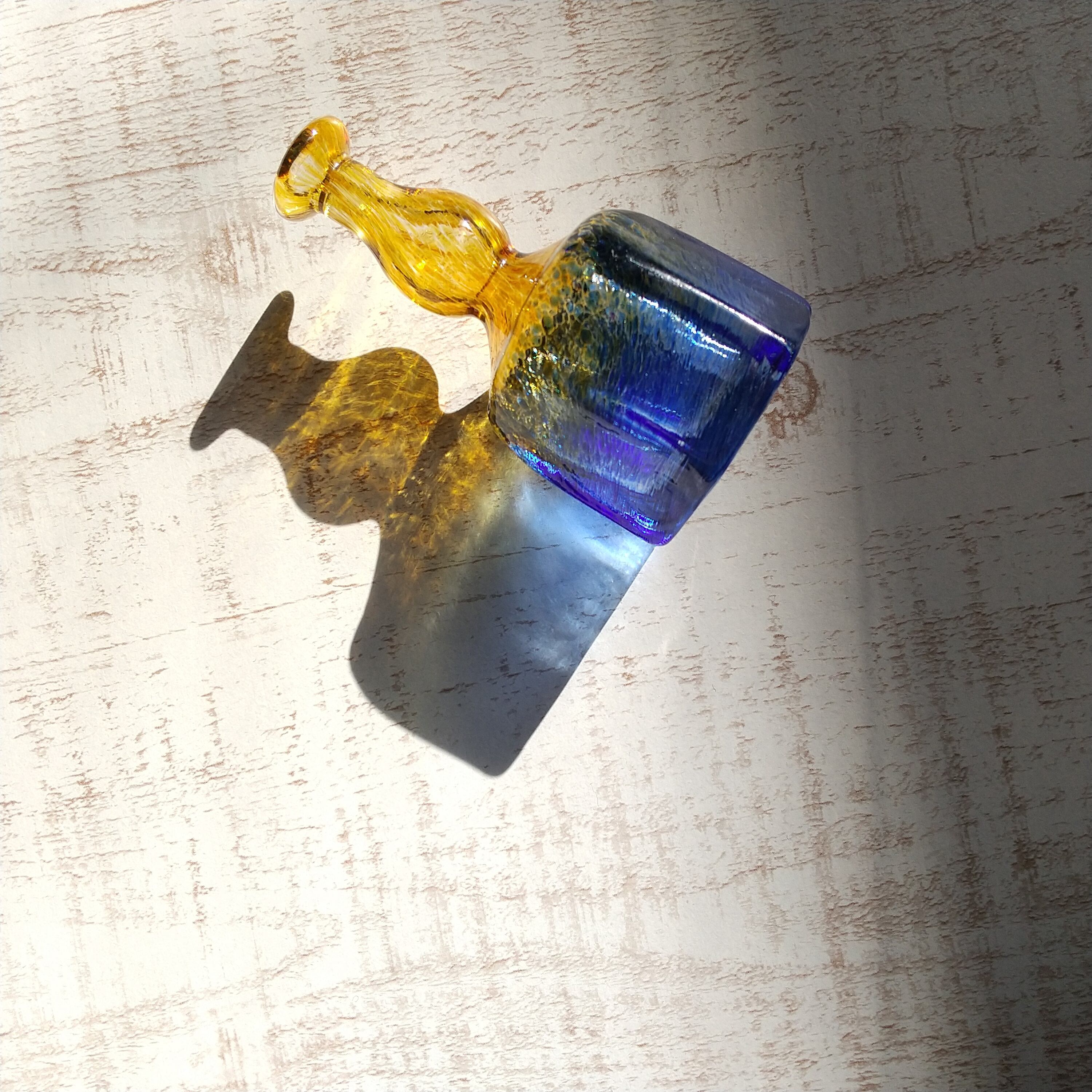 スウェーデンのKosta BodaにてBertil Vallien(バーティル・ヴァリーン)がデザインしたガラスベースです。小さな可愛らしいフォルムの中に、色彩鮮やかな模様がとても繊細で印象的な作品。日差しに当たった瑞々しいグラデーションの影は、まるで湖水のようにとても美しいです。細くて繊細な口にも細かな模様が施されています。首の部分の水色から黄色に向かうグラデーションも素敵です。小ぶりな一輪挿しですが、ガラス作品として飾っておくだけでもお楽しみいただける抜群の魅力があります。