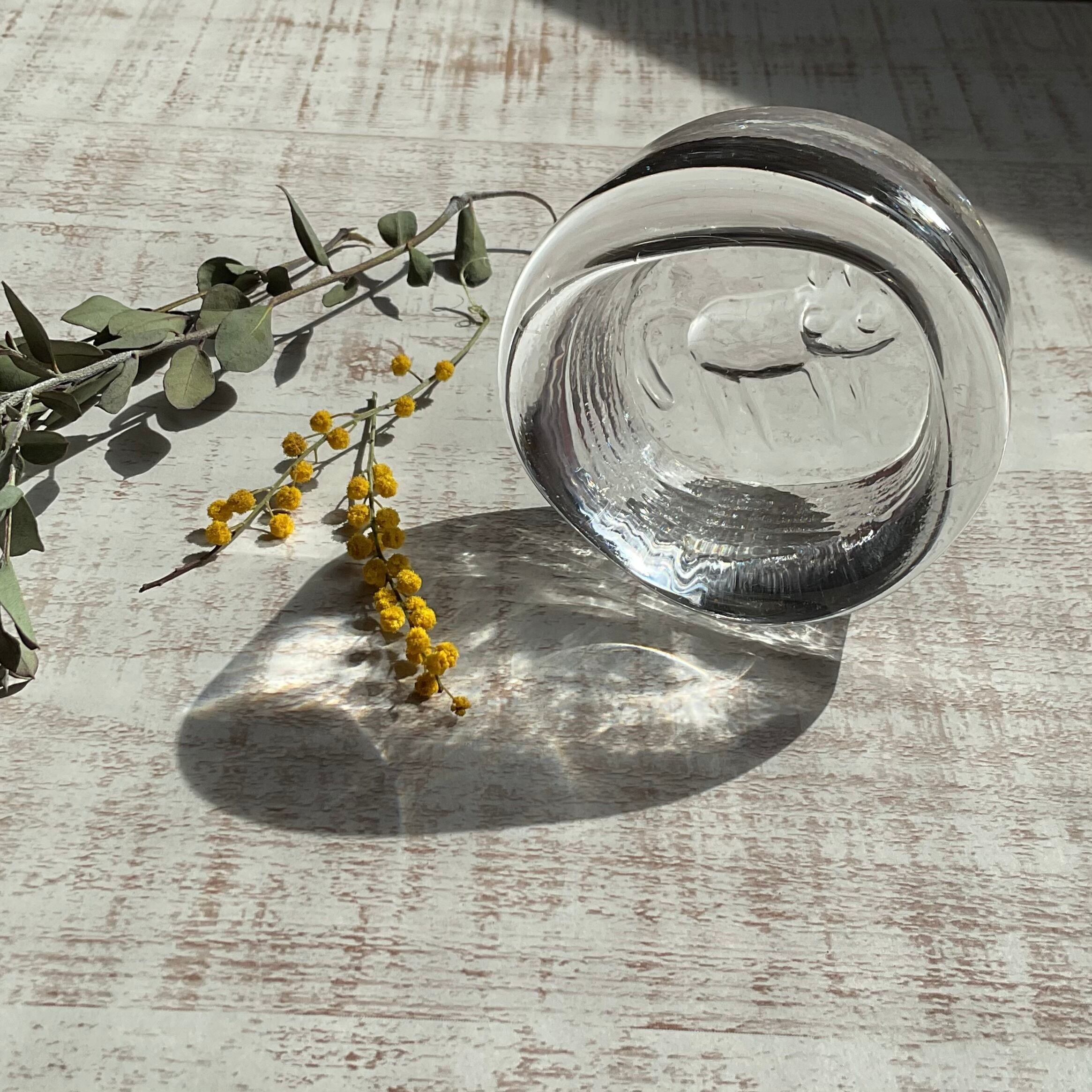 ぽってりと厚みのあるクリアのガラスに、可愛らしい猫のモチーフが入っています。