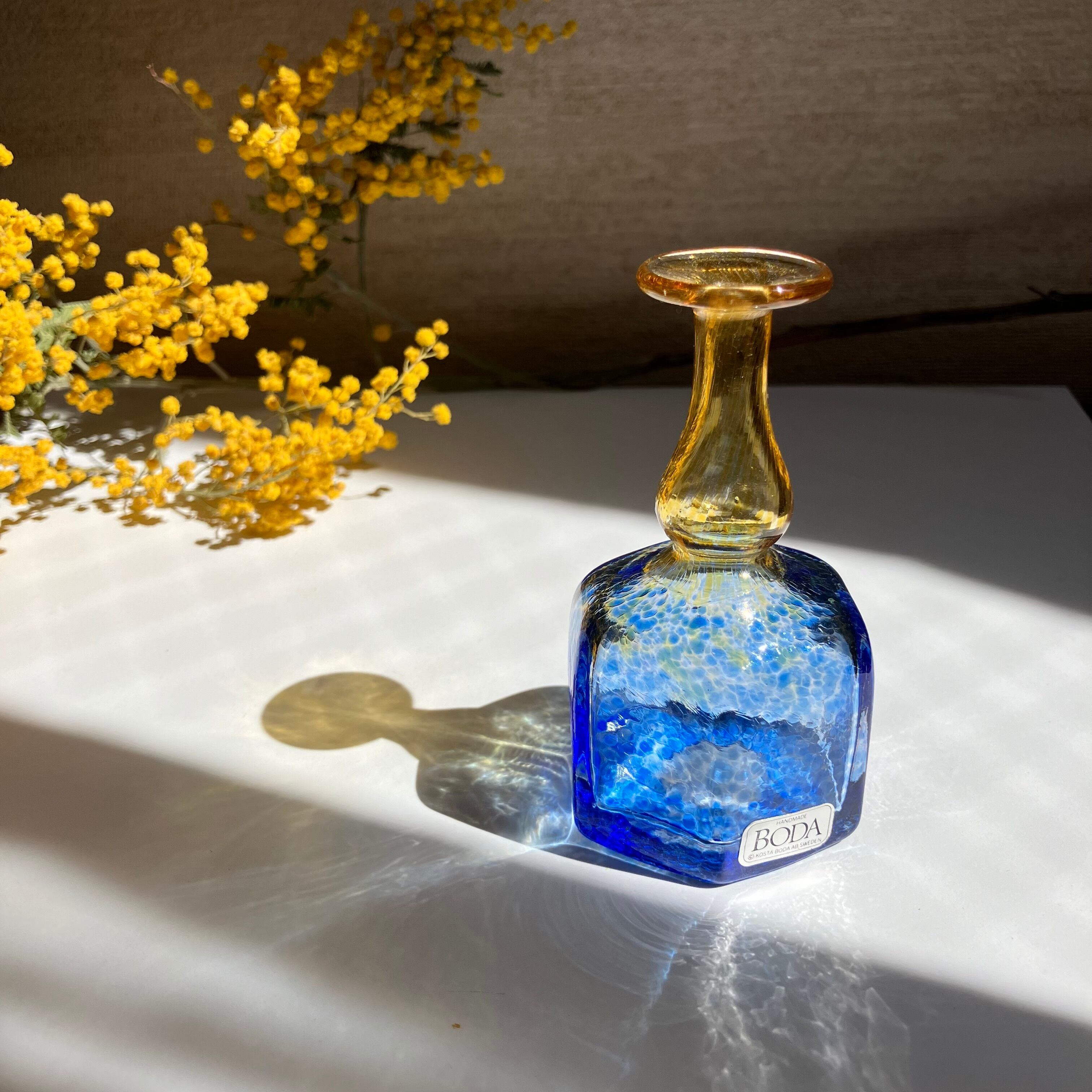 スウェーデンのKosta BodaにてBertil Vallien(バーティル・ヴァリーン)がデザインしたガラスベースです。小さな可愛らしいフォルムの中に、色彩鮮やかな模様がとても繊細で印象的な作品。日差しに当たった瑞々しいグラデーションの影は、まるで湖水のようにとても美しいです。細くて繊細な口の先まで模様が施されています。