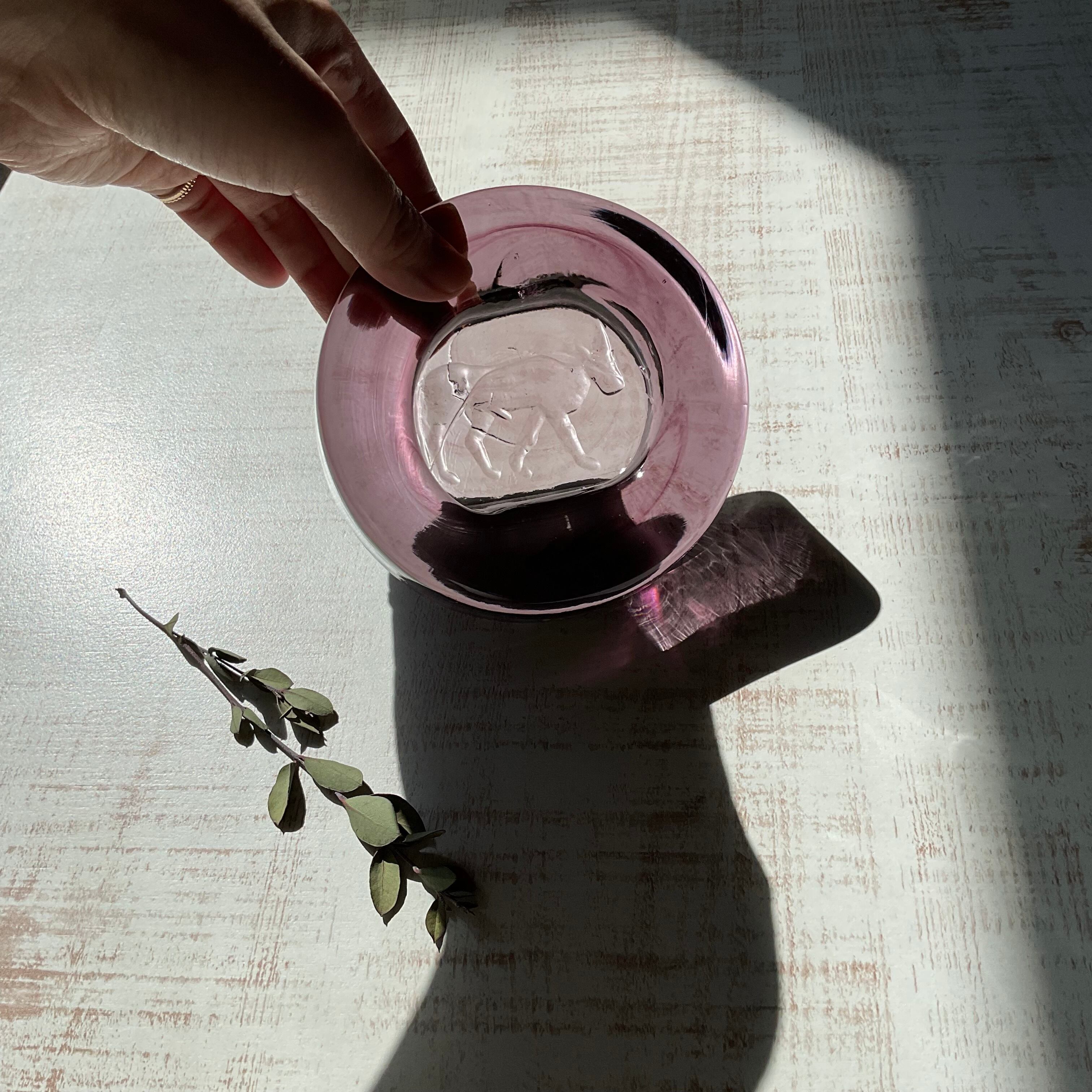 つるつるとして艶があり、ぽってりと厚みのあるパープルカラーのガラスに、牛がゆったりと歩く姿が印象的なデザイン。ガラスの重量感を感じる贅沢で大きめのサイズです。